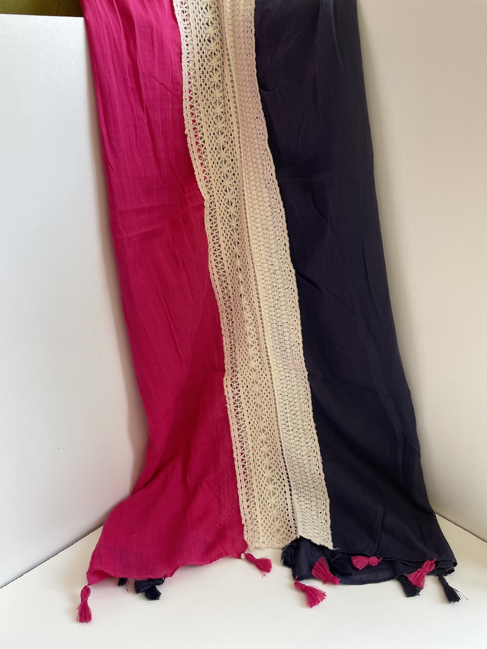 شال نخی دو رنگ با نوار کنفی۳۸۷٬۰۰۰ تومان